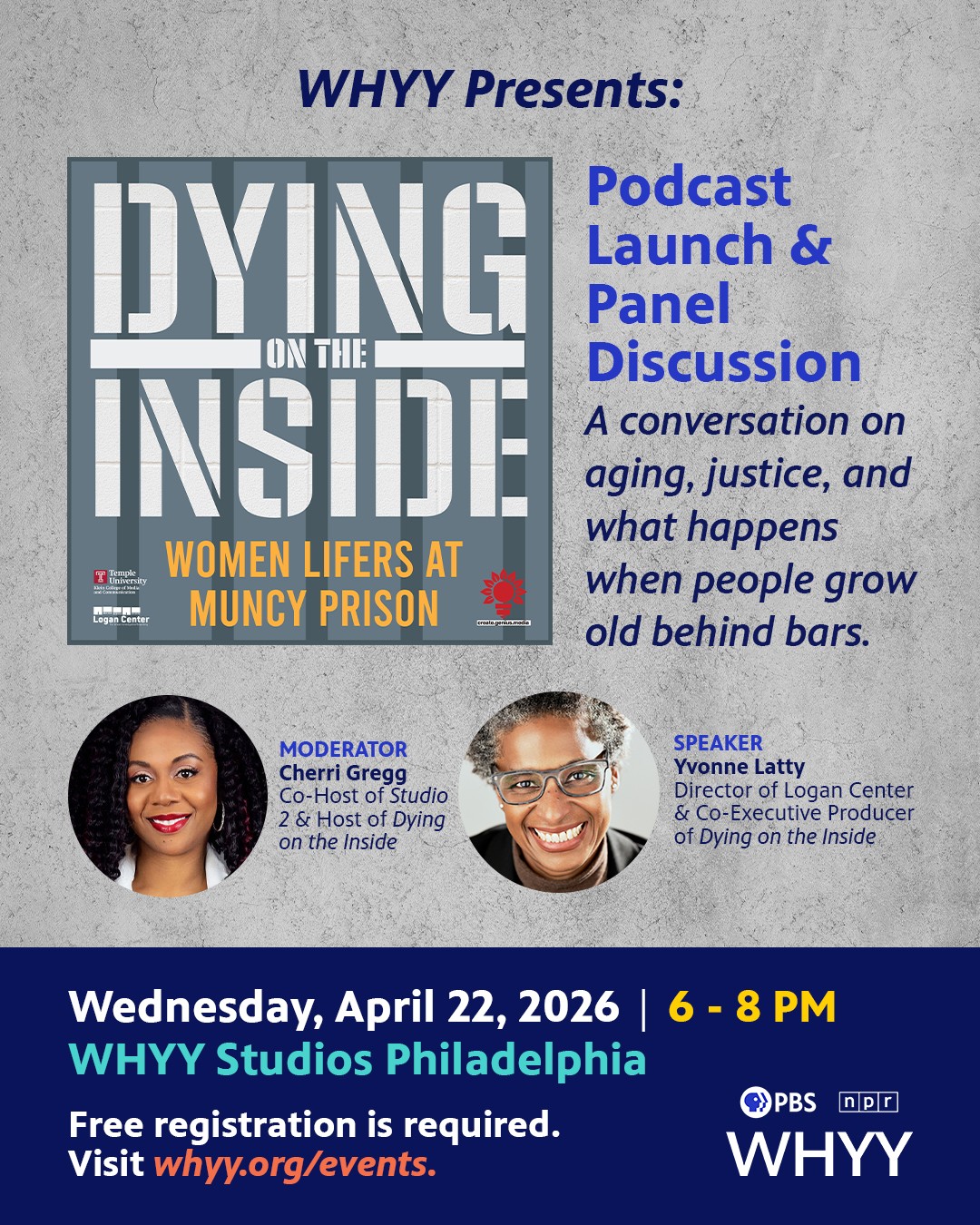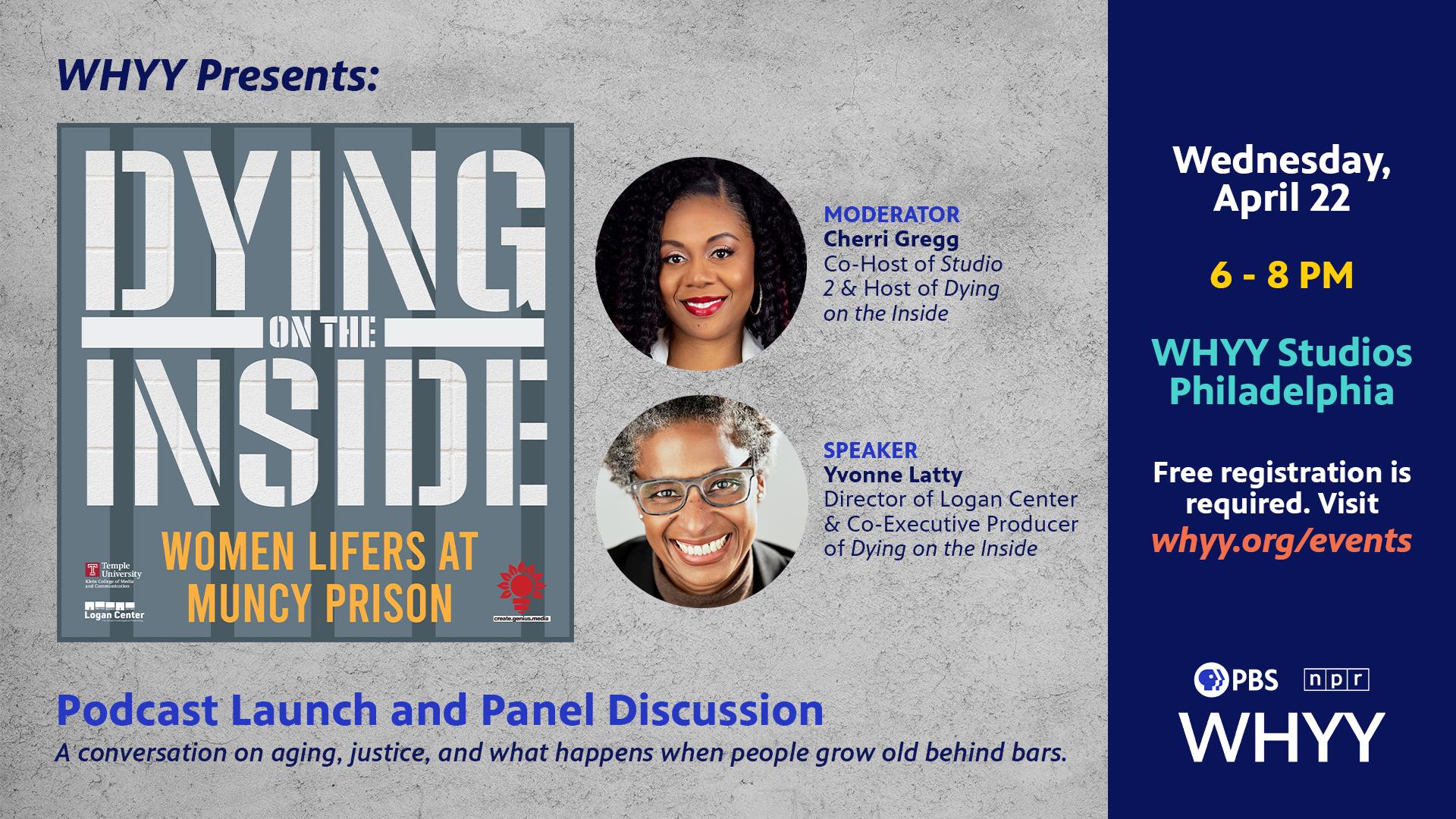What happens when people grow old in a system that was never built to care for them? Join WHYY for the launch of Dying on the Inside: Women Lifers at Muncy Prison— a new investigative podcast examining the national crisis of aging and dying behind bars through the eyes of women serving life sentences in Pennsylvania. Hosted by Cherri Gregg, co-host of Studio 2, and produced in partnership with Temple University’s Logan Center for Urban Investigative Reporting, the series brings listeners inside one of the most urgent—and often overlooked—issues in the criminal justice system.